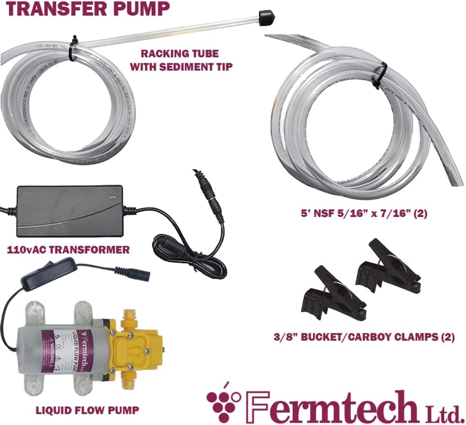 - This kit, complete with self-priming diaphragm pump, tubing, and a racking cane with removable tip and 2 Carboy / Pail clamps.