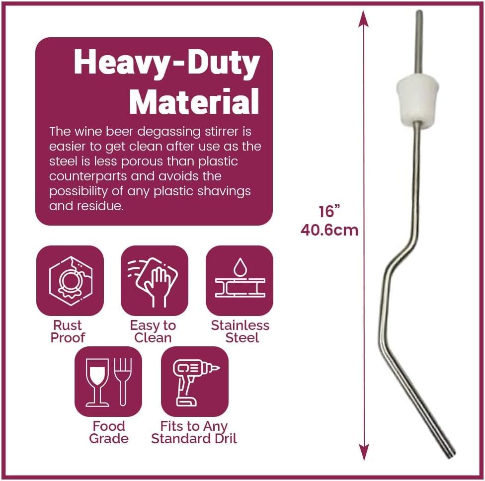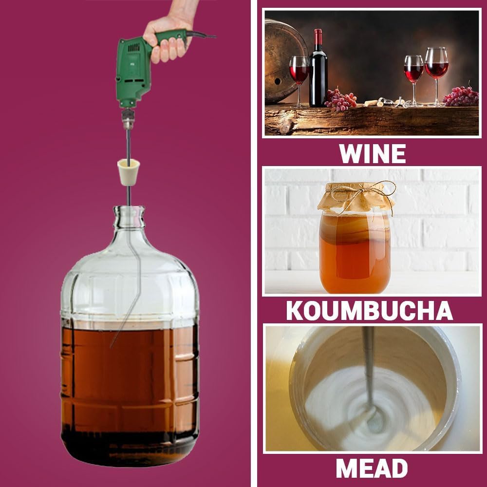 Shock absorbing bung included to help with smooth operation. Will fit standard #6.5 carboy opening. 16" In Length will fit all carboyspails and demijohns including 1 Gallon, 3 Gallon, 6 and 7 and many more. Our propritary bent arm that is shared with our plastic Whip will increae agitation over competing products for faster and cleaner degassing and mixing of your wine beer mead kombucha.