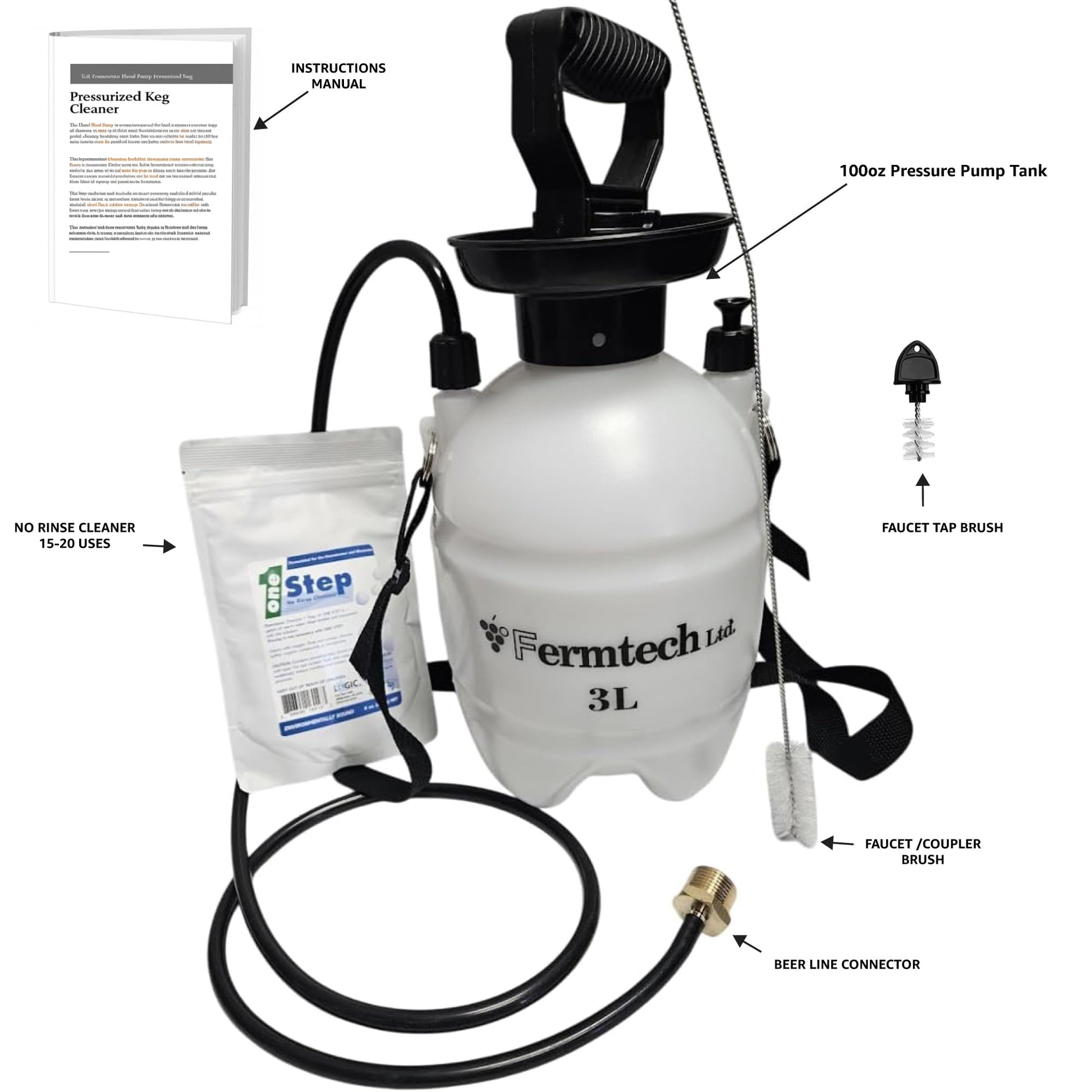 ALL IN ONE CLEANING KIT - This keg cleaning kit has everything you need to clean your taps system. This beer line cleaner set has 4 ounces of Fermtech NO RINSE powder solution, a plastic pressure tank, a beer line adapter, faucet brush/plug, coupler brush so you won't have to miss a tool or buy them individually!